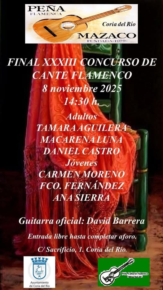 Peña Cultural Flamenca Mazaco de Coria del Río. GRAN FINAL DEL XXXIII CONCURSO DE CANTE FLAMENCO. Sábado 8 de octubre a las 14:30 h. Entrada libre hasta completar aforo.