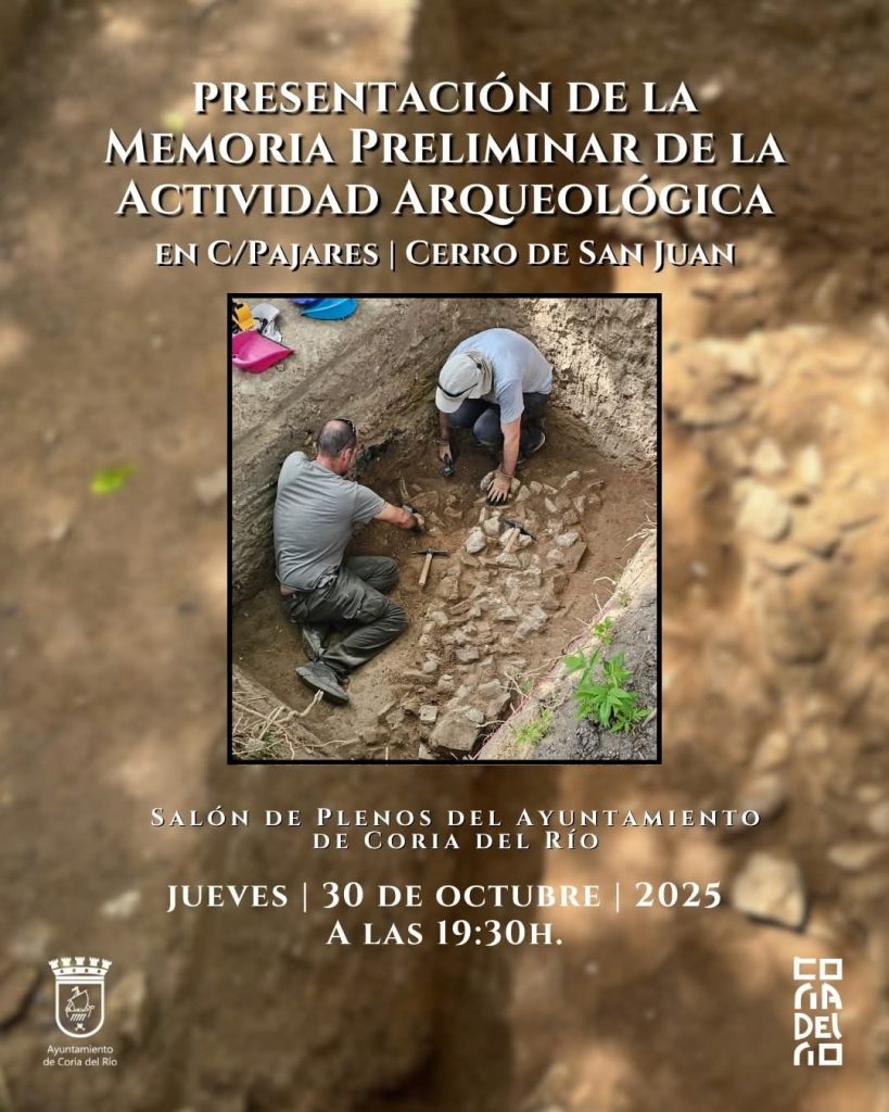El próximo 30 de octubre a las 19:30h, el Ayuntamiento de Coria del Río celebrará en su Salón de Plenos la presentación de la Memoria Preliminar de la Actividad Arqueológica realizada en Calle Pajares, en el histórico Cerro de San Juan.
