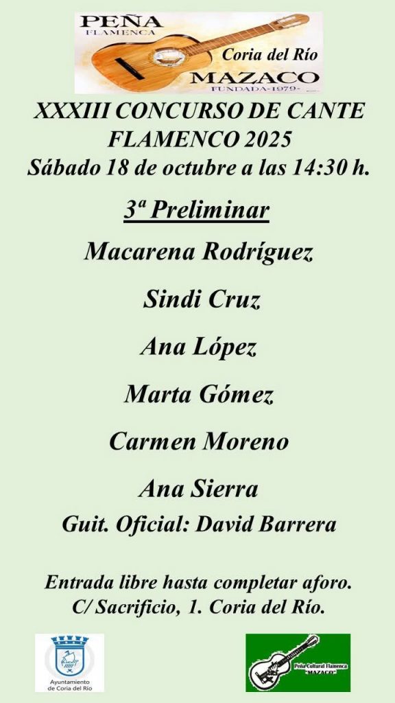 El próximo sábado 18 de octubre, la Peña Cultural Flamenca MAZACO de Coria del Río abrirá sus puertas para celebrar la tercera preliminar de su XXXII Concurso de Cante Flamenco, un evento que reúne a grandes talentos.