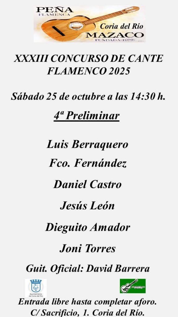 El próximo domingo 26 de octubre, la Peña Cultural Flamenca «MAZACO» de Coria acogerá la cuarta preliminar del XXXIII Concurso de Cante Flamenco, un evento que promete reunir a destacados artistas del panorama flamenco.